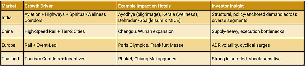 Unlike Europe’s event-led surges (Paris Olympics, Frankfurt Messe) or China’s supply-heavy megacity expansions, India’s growth is multi-nodal, policy anchored, and domestically driven. Aviation and highways are creating new circuits, while pilgrimage and wellness corridors are embedding structural repeat demand. This positions India uniquely: one of the few markets where both scale and diversity of demand are expanding simultaneously.